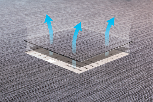 オフィス空間で発生した熱や汚染空気を周辺に拡散することなく、上部空間へ押上げる空調システム。床全面から均一に空気が供給され、そのまま天井へ押上がるので、埃や汚染空気が下降・拡散することなく快適な空間を保ちます。