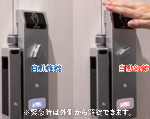 非接触センサーに手をかざすだけでブース扉を解錠できる装置、タッチレスの自動水栓や人感センサーによる照明器具を設置することで、感染対策に配慮した衛生的なトイレ空間を提供します。