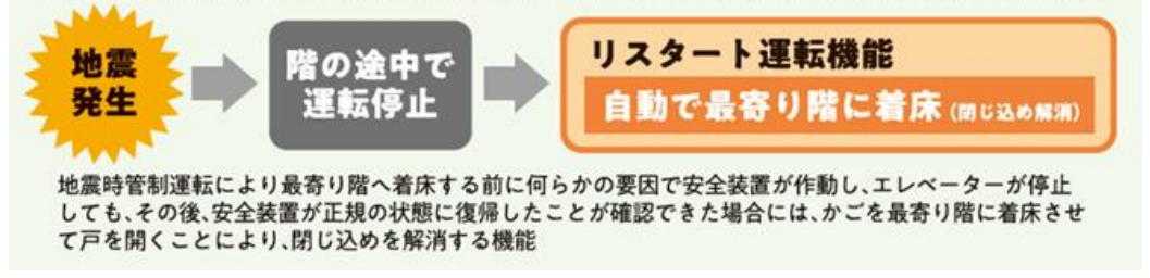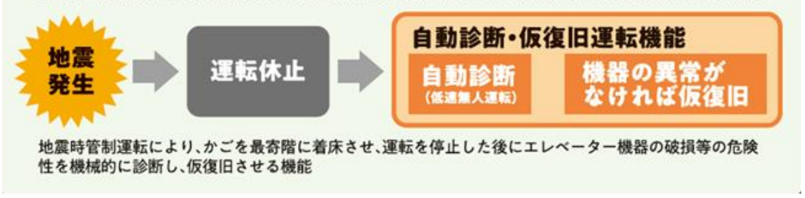エレベーターの安全強化として、「地震時管制運転装置」の設置や「主要機器の耐震補強」のほか、耐震強度の高いマンションにおいては、発災時のエレベーターの閉じ込め防止に資する「リスタート運転機能」や、発災後の早期の利用再開に資する「自動診断・仮復旧運転機能」を整備することにより、災害時の閉じ込めリスクを低減することができます。